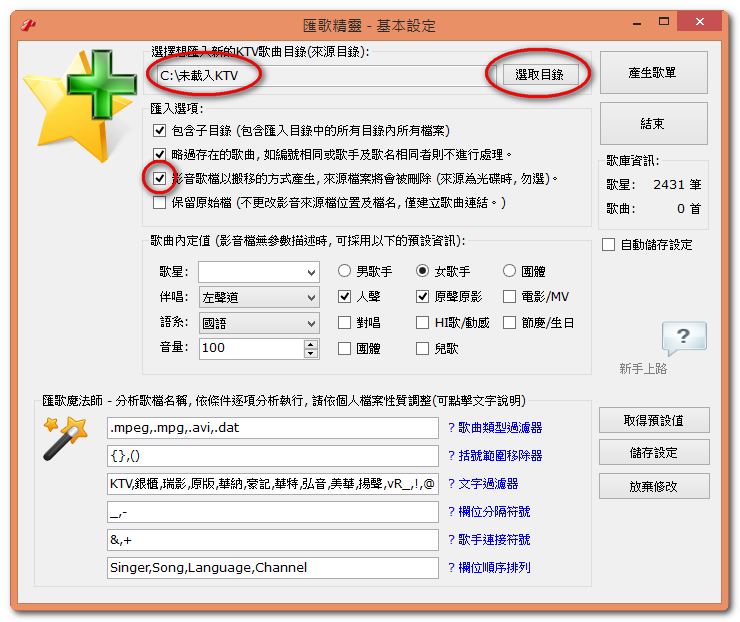 歌星資料夾 - 資料夾以歌星名稱命名,記得把欄位順序中singer刪除即可自動判斷singer(另外也請不要設定內定值)。